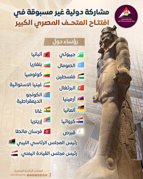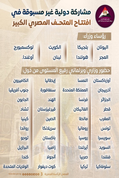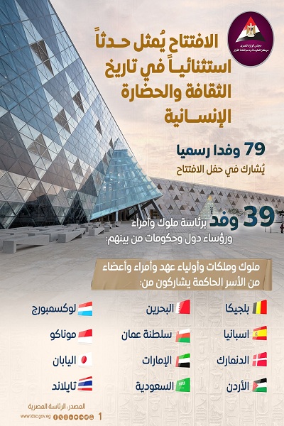 يُرفع مساء اليوم النقاب عن المتحف المصري الكبير في حفلٍ مهيبٍ يشهده الرئيس عبد الفتاح السيسي، بحضور 79 وفدًا من مختلف دول العالم، في حدثٍ يجسد رؤية مصر التي جمعت بين عبق الماضي وبهاء الحاضر.