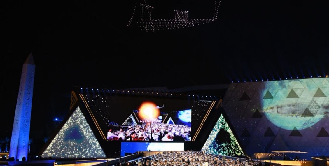 جدير بالذكر أن الاحتفالية شهدت عرضاً فنياً بعنوان "العالم يعزف لحناً واحداً"، أعقبه عرض "الليزر والدرونز"، والذي شرح نظرية "حزام اوريون"، وعلاقة بناء المتحف المصري الكبير بالأهرامات، ليأتي من بعده عرض فني بعنوان "رحلة سلام في أرض السلام"، تخلله مشهد فني عن إبداع المصريين في البناء بداية من بناء هرم زوسر حتى البناء في العصر الحديث، ليستمع الحضور لأغنية قبطية، وإنشاد صوفي، ثم عرض آخر بالدرونز يظهر عبارة "الحضارات تزدهر وقت السلام