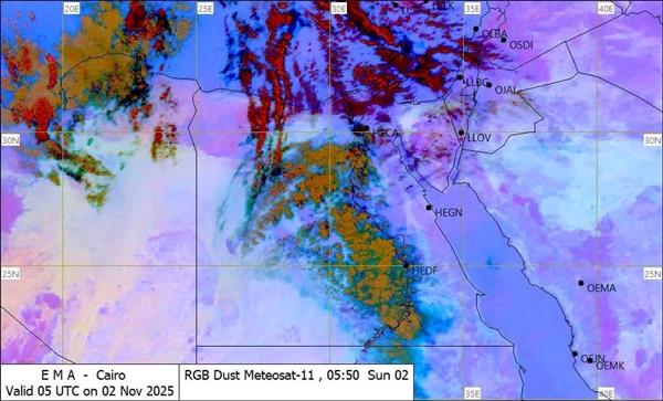 ومن المتوقع أن يصاحب هذه السحب سقوط أمطار متوسطة إلى رعدية أحيانًا على مناطق من شمال الصعيد والصحراء الغربية، مع نشاط للرياح الناتجة عن الهواء الهابط من أسفل السحب الرعدية، مما قد يثير الرمال والأتربة على بعض المناطق.