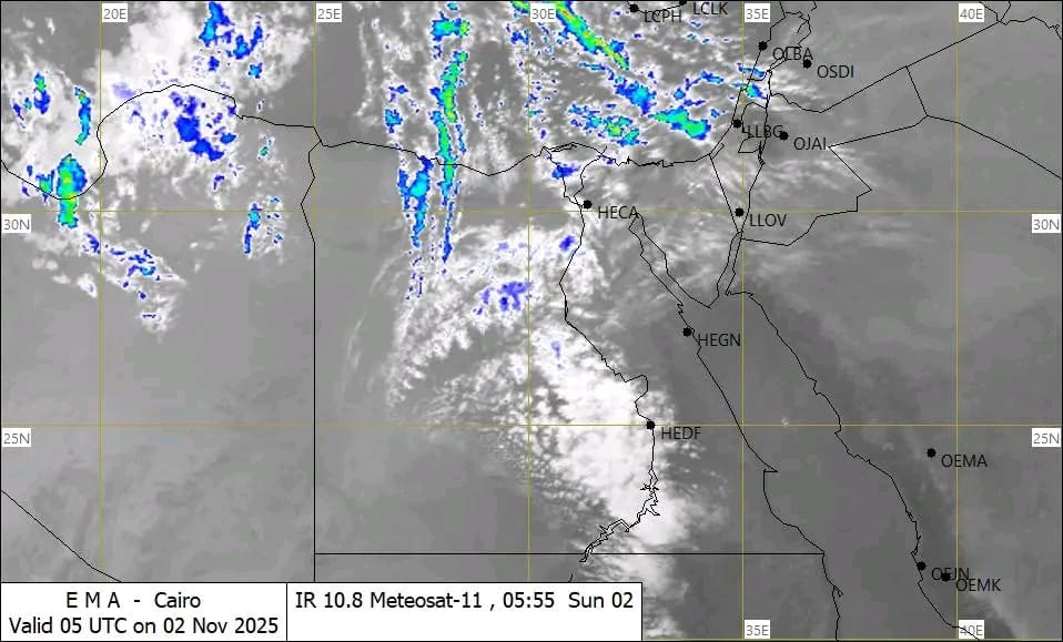 وكشفت الأرصاد، أن أحدث صور الأقمار الصناعية تشير إلى تكاثر السحب المنخفضة والمتوسطة على مناطق متفرقة من الصحراء الغربية وجنوب البلاد، وصولًا إلى القاهرة الكبرى، وذلك مع بداية أولى حالات فصل الخريف المطيرة.