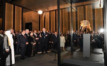 واختتم الاحتفال بتفقد الحضور قاعة "توت عنخ آمون" في المتحف المصري الكبير، التي عرضت لأول مرة كاملة منذ اكتشاف مقبرته في نوفمبر 1922، وذلك بحضور الرئيس وقرينته.
