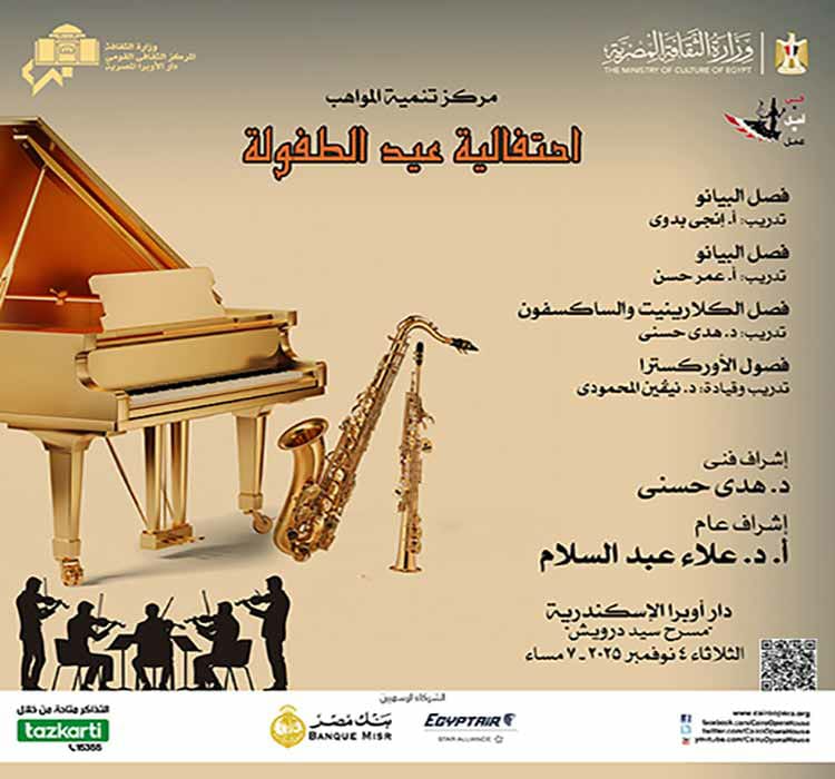 تحتفل دار الأوبرا المصرية بأعياد الطفولة خلال حفل للواعدين بمركز تنمية المواهب بأوبرا الإسكندرية بإشراف الدكتورة هدى حسني وذلك في السابعة مساء الثلاثاء المقبل الموافق 4 نوفمبر على مسرح سيد درويش «أوبرا الإسكندرية».