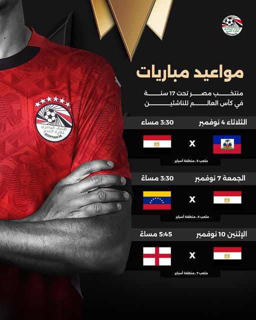 كشف اتحاد الكرة المصري عن مواعيد مباريات منتخب مصر للناشئين في بطولة كأس العالم التي تستضيفها قطر خلال الفترة من 3 إلى 27 نوفمبر المقبل.