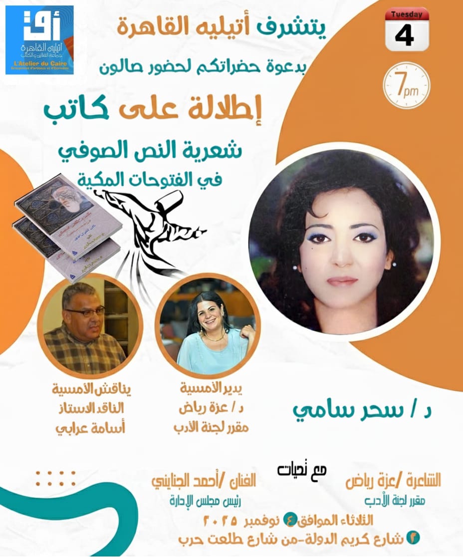 ينظم أتيليه القاهرة ندوة جديدة ضمن فعاليات صالون "إطلالة على كاتب" لمناقشة كتاب الكاتبة سحر سامي بعنوان «شعرية النص الصوفي في الفتوحات المكية – محيي الدين بن عربي».