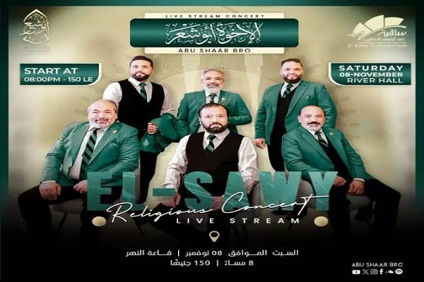 تستضيف ساقية عبد المنعم الصاوي أمسية إنشاد ديني مميزة يحييها فريق الإخوة أبو شعر، وذلك في تمام الثامنة مساء يوم السبت 8 نوفمبر بقاعة النهر.