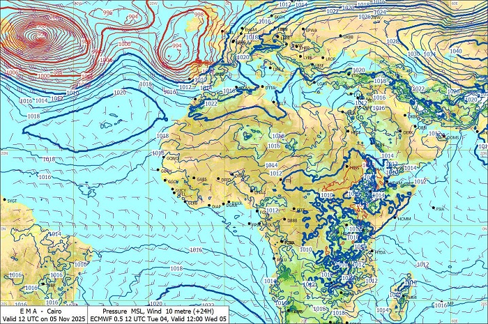 وبالنسبة للظواهر الجوية المتوقعة اليوم، فرص أمطار خفيفة إلى متوسطة قد تكون رعدية أحيانا ًعلى بعض المناطق من السواحل الشمالية الغربية وشمال الوجه البحرى، وهناك فرص ضعيفة جدا لأمطار خفيفة على مناطق من جنوب الوجه البحرى والقاهرة الكبرى ومدن القناة.