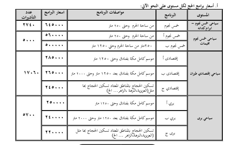 أسعار برنامج الحج السياحي البري فئة (أ): نحو 250 ألف جنيه مصري، ويتضمن الإقامة في فنادق بمكة المكرمة على مسافة لا تتجاوز 1250 مترًا من الحرم.