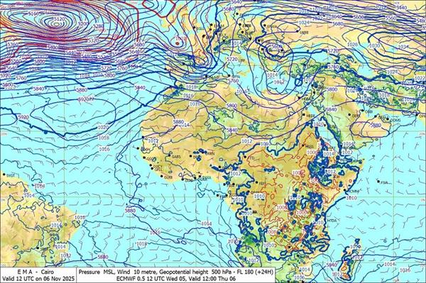 أما بالنسبة للظواهر الجوية المتوقعة اليوم، فهناك فرص لسقوط أمطار خفيفة قد تكون متوسطة أحياناً على بعض المناطق من السواحل الشمالية الغربية وشمال الوجه البحرى ، وتمتد فرص ضعيفة جدا ً لأمطار خفيفة على مناطق من جنوب الوجه البحرى والقاهرة الكبرى.