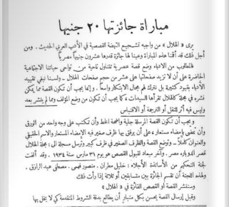 يری «الهلال» من واجبه تشجيع النهضة القصصية في الأدب العربي الحديث، ومن أجل ذلك قد أقمنا هذه المباراة وعينا لها جائزة قدرها «عشرون جنيها مصريا».