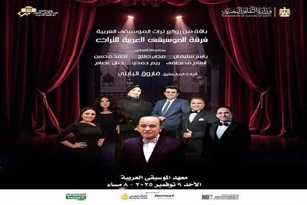 نخبة من ذهبيات الطرب تقدمها دار الأوبرا المصرية برئاسة الدكتور علاء عبد السلام خلال حفل فرقة الموسيقى العربية للتراث بقيادة المايسترو فاروق البابلى المقام في الثامنة مساء غد الأحد ٩ نوفمبر على مسرح معهد الموسيقى العربية منها أنا فى انتظارك، موشح عنق المليح الغالى، بحلم بيك، القلل القناوى، إنت الحب، على فكرة إزيهم، ليلة من الليالى، مستحيل، ساكن في حى السيدة وتقاسيم .. تحفيظ عاطف عبد الحميد وأداء كل من ياسر سليمان، محيى صلاح، أحمد محسن، أنغام مصطفى، ريم حمدى، حنان عصام وعازفة القانون عفاف شكرى .