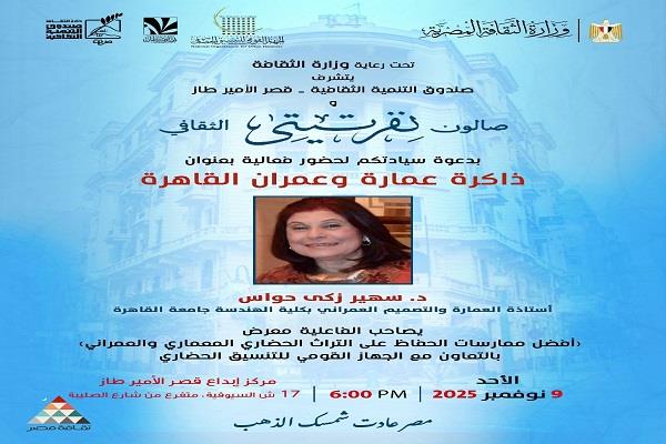 من أجل تعزيز الحوار الثقافي والفكري حول قضايا التراث والهوية في ضوء التطورات المعاصرة، يعقد صالون نفرتيتي الثقافي فعالية جديدة بعنوان “ذاكرة عمارة وعمران القاهرة”. يستضيف فيها الدكتورة سهير زكي حواس، أستاذ العمارة والتصميم المعماري بكلية الهندسة – جامعة القاهرة، وذلك يوم غد الأحد المقبل ٩ نوفمبر في تمام الساعة السادسة مساء بقصر الأمير طاز التابع لقطاع صندوق التنمية الثقافية.