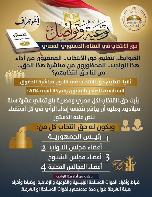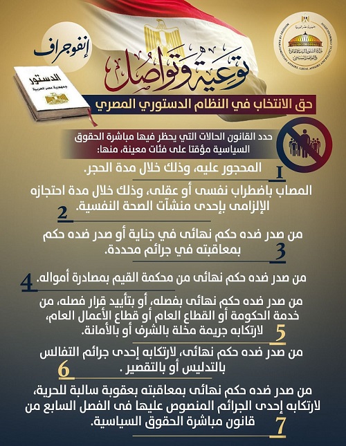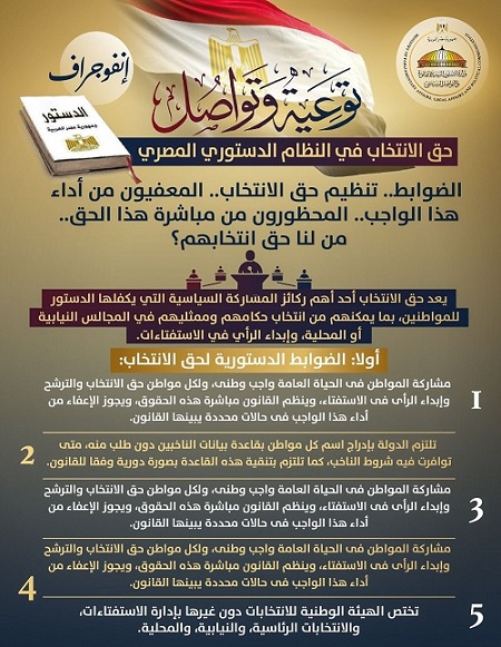 نشرت وزارة الشؤون النيابية والقانونية والتواصل السياسي إنفوجرافًا بعنوان :توعية وتواصل.. حق الانتخاب في النظام الدستوري المصري..  الضوابط.. تنظيم حق الانتخاب.. المعفيون من أداء هذا الواجب.. المحظورون من مباشرة هذا الحق".