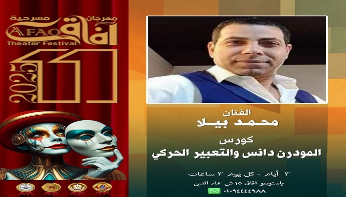 ضمن فعاليات يوم الإثنين 10 نوفمبر بالدورة الحادية عشرة لمهرجان آفاق والتي تحمل اسم الفنان القدير عبد الوارث عسر وبرئاسة شرفية للفنان القدير محمد صبحي، وتحت رعاية وزارة الثقافة المصرية، يقدم الفنان محمد بيلا كورس في الرقص الحديث في الرابعة عصرا ويبدأ كورس الفنان مصطفى حزين للتمثيل الصامت في السابعة مساءً.