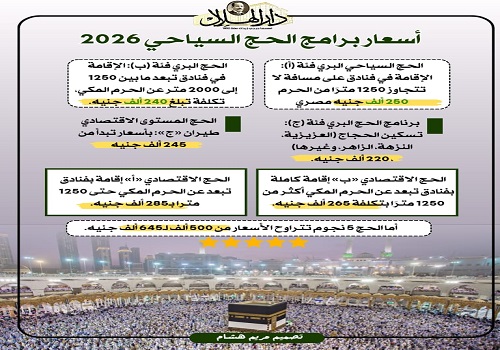 كما كشفت الوزارة عن أسعار برامج الحج السياحي لموسم 2026، والتي شهدت تخفيضات تصل إلى 20 ألف جنيه مقارنة بالعام الماضي، مع مراعاة تنوع شرائح المجتمع وتقديم خيارات متعددة تناسب مختلف الفئات الاجتماعية والاقتصادية، فقد انخفضت أسعار برامج الحج السياحي 2026 بين 5 و20 ألف جنيه للبرنامج الواحد، وجاءت الأسعار كالتالي: