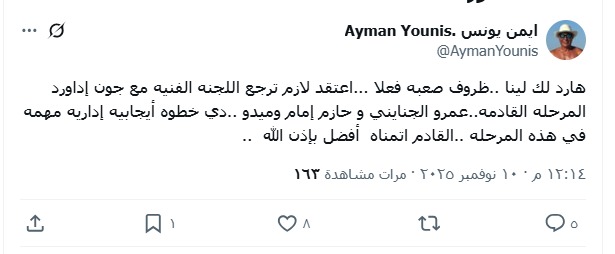 ونشر أيمن يونس عبر حسابه الشخصي على "إكس": هارد لك لينا ظروف صعبة فعلا، أعتقد لازم ترجع اللجنة الفنية مع جون إداورد المرحلة القادمة، عمرو الجنايني وحازم إمام وميدو، دي خطوه إيجابية إدارية مهمة في هذه المرحلة، القادم أتمناه أفضل بإذن الله.