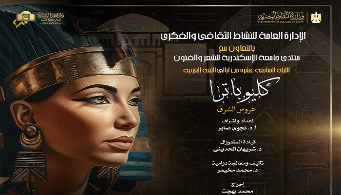 بالتعاون بين دار الأوبرا المصرية عبر النشاط الثقافي والفكري ومنتدى جامعة الإسكندرية للشعر والفنون تعقد الليلة السابعة عشر من ليالي اللغة العربية والتي تحمل عنوان «كليوباترا عروس الشرق» وتأتى في اطار خطط وزارة الثقافة التنويرية وذلك في السابعة مساء الخميس المقبل 13 نوفمبر على مسرح الجمهورية.
