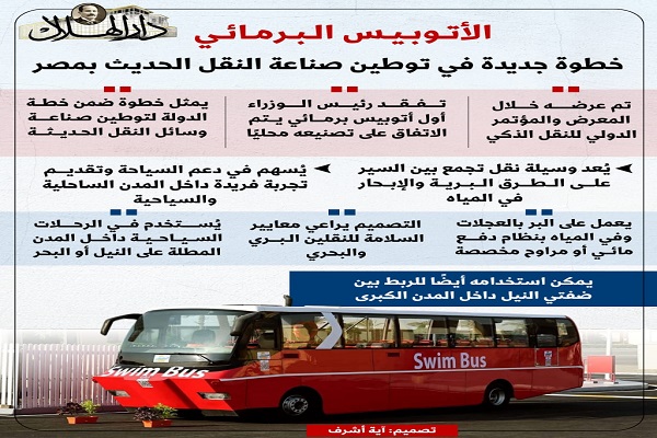 في إطار جهود الدولة لتوطين صناعة وسائل النقل الحديثة وتطوير منظومة النقل الذكي، شهد الدكتور مصطفى مدبولي، رئيس مجلس الوزراء، تفقد أول أتوبيس برمائي يتم الاتفاق على تصنيعه محليًا في مصر، وذلك خلال فعاليات المعرض والمؤتمر الدولي للنقل الذكي.