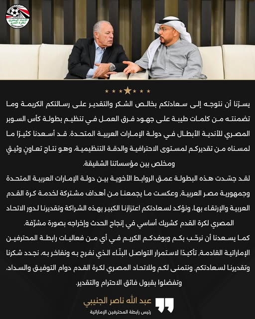 وجه السيد عبد الله ناصر الجنيبي رئيس رابطة المحترفين الإماراتية، والنائب الأول لرئيس اتحاد الإمارات لكرة القدم، الشكر هاني أبو ريدة رئيس مجلس إدارة الاتحاد المصري لكرة القدم، على رسالته التي تضمنت الإشادة بجهود فرق العمل في تنظيم بطولة كأس السوبر المصري للأندية الأبطال، في دولة الإمارات العربية المتحدة.