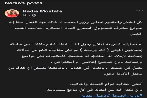 وكتبت عبر حسابها الرسمي على موقع التواصل الاجتماعي الفيسبوك: "كل الشكر والتقدير لمعالي وزير الصحة د. خالد عبد الغفار حقًا إنه نموذج مشرف للمسؤول المصري الجاد المحترم صاحب القلب الكبير".
