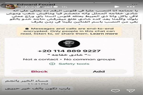 ونشر إدوارد خاصية "الستوري" على حسابه الرسمي بالإنستجرام، قائلًا: "يا جماعة أنا اتنصب عليا في فلوس، الرقم ده بعتلي على إنه شادي خفاجة الممثل، وإنه متعشم في ومافيش شغل ومش لاقي ياكل، وأنا زي العبيط بعتله فلوس إنستا باي، وراح عاملي بلوك".