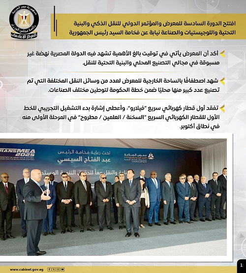 وتضمنت الأنشطة، افتتاح رئيس الوزراء الدورة السادسة للمعرض والمؤتمر الدولي للنقل الذكي والبنية التحتية واللوجستيات والصناعة نيابة عن السيد الرئيس، مؤكدًا أن المعرض يأتي في توقيت بالغ الأهمية تشهد فيه الدولة نهضة غير مسبوقة في مجالي التصنيع المحلي والبنية التحتية للنقل؛ حيث شهد سيادته اصطفافًا بالساحة الخارجية للمعرض لعدد من وسائل النقل المختلفة التي تم تصنيع عدد كبير منها محليًا.