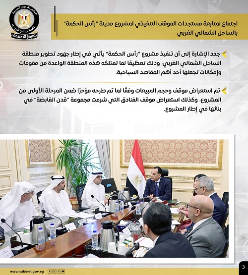 وتضمنت الأنشطة، اجتماعًا لمتابعة مستجدات الموقف التنفيذي لمشروع مدينة "رأس الحكمة" بالساحل الشمالي الغربي، حيث تم استعراض موقف وحجم المبيعات وفقًا لما تم طرحه مؤخرًا ضمن المرحلة الأولى من المشروع، وكذلك استعراض موقف الفنادق التي شرعت مجموعة "مُدن القابضة" في بنائها في إطار المشروع.