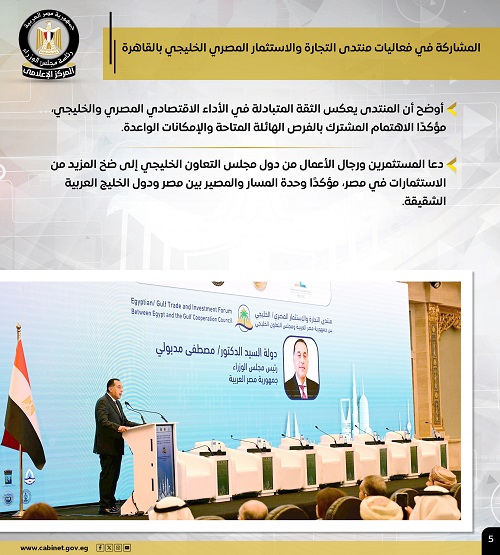 وشارك رئيس الوزراء في فعاليات منتدى التجارة والاستثمار المصري الخليجي بالقاهرة، حيث أوضح أن المنتدى يعكس الثقة المتبادلة في أداء الاقتصاد المصري والخليجي، مؤكدًا الاهتمام المشترك بالفرص الهائلة المتاحة والإمكانات الواعدة، كما دعا المستثمرين ورجال الأعمال من دول مجلس التعاون الخليجي إلى ضخ المزيد من الاستثمارات في مصر.