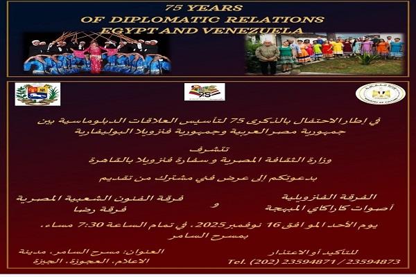 في إطار الاحتفال بمرور 75 عامًا على تأسيس العلاقات الدبلوماسية بين جمهورية مصر العربية وجمهورية فنزويلا البوليفارية، تنظم وزارة الثقافة المصرية بالتعاون مع سفارة فنزويلا بالقاهرة عرضًا فنيًا مشتركًا يجمع بين الفنون المصرية والفنزويلية في أمسية ثقافية وفنية مميزة.