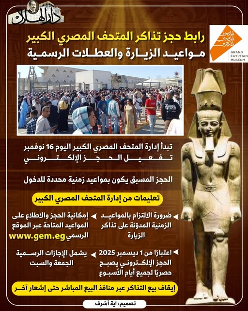 في إطار سعي المتحف المصري الكبير لتطوير تجرِبة الزيارة ورفع كفاءة الخدمات المقدمة للجمهور، أعلنت إدارة المتحف عن بدء تطبيق نظام الحجز المسبق لتذاكر الدخول وفق مواعيد زمنية محددة، بما يضمن تنظيم حركة الزائرين وتحقيق أعلى مستويات الراحة والانسيابية داخل واحد من أهم الصروح الثقافية في العالم.