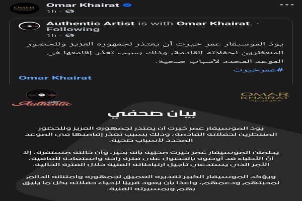 وجاء في البيان: يود الموسيقار عمر خيرت أن يعتذر لجمهوره العزيز وللحضور المنتظرين لحفلاته القادمة، وذلك بسبب تعذر إقامتها في الموعد المحدد لأسباب صحية.