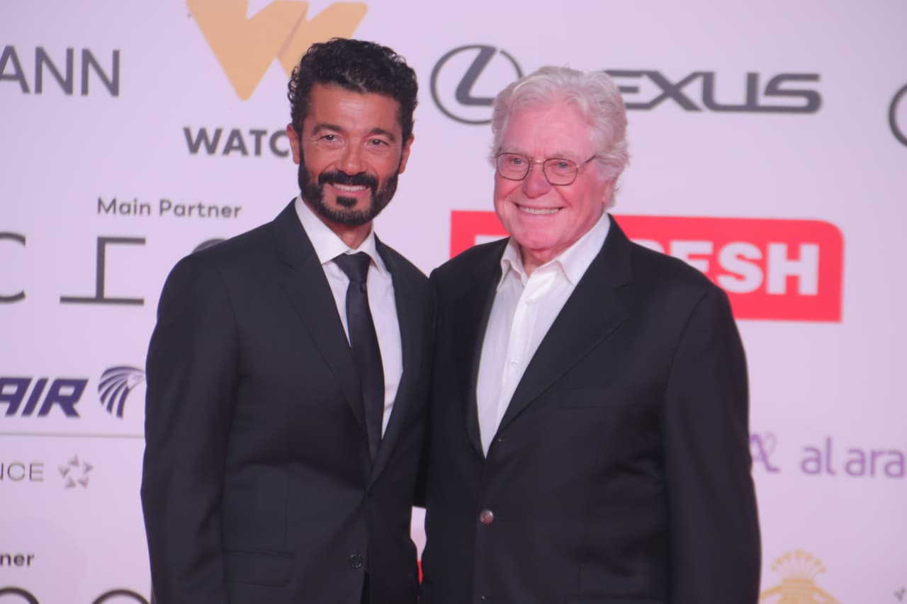 وحضر العرض عدد من النجوم، من بينهم الفنان الكبير حسين فهمي، الذي التقط صورًا مع خالد النبوي على السجادة الحمراء، في لحظة حظيت بتفاعل واسع داخل المهرجان.