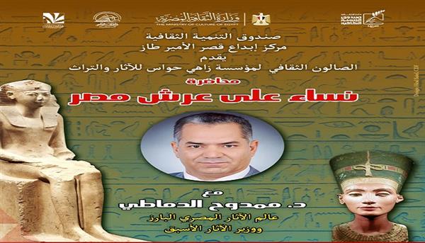 ينظم قطاع صندوق التنمية الثقافية من خلال مركز إبداع قصر الأمير طاز بحي الخليفة محاضرة بعنوان «نساء على عرش مصر»، وذلك بالتعاون مع الصالون الثقافي لمؤسسة زاهي حواس للآثار والتراث، يوم غدا الثلاثاء 18 نوفمبر في السابعة مساءً.