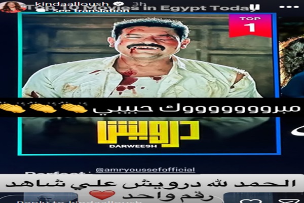 ونشرت كندة بوستر فيلم "درويش" مهنئة زوجها على احتفاظه بالمركز الأول ضمن الأعمال الأكثر رواجًا، مُرفقة تهنئتها بعبارات الفخر والتصفيق.