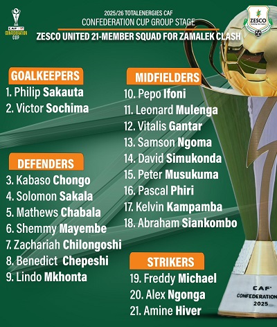 تصل بعثة الفريق الأول لكرة القدم بنادي زيسكو الزامبي إلى القاهرة صباح غدٍ الخميس، استعدادًا لمواجهة فريق الزمالك في الجولة الأولى لمباريات دور المجموعات لبطولة كأس الكونفدرالية الأفريقية.