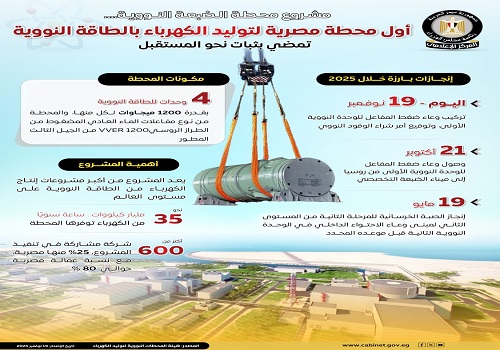 أكد الإنفوجراف الصادر عن المركز الإعلامي لمجلس الوزراء أن المحطة تمثل أول محطة مصرية لتوليد الكهرباء بالطاقة النووية، وتعد إضافة استراتيجية تدعم خطط الدولة للتحول في قطاع الطاقة، وتعزز التنمية المستدامة، مع رفع كفاءة الكوادر المصرية في مجال التكنولوجيا النووية السلمية.