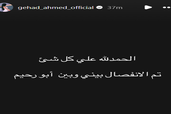 وكتبت جهاد عبر خاصية الستوري نشرتها عبر حسابها الخاص على موقع التواصل الاجتماعي لتبادل الصور والفيديوهات إنستجرام: "الحمد لله على كل شيء.. تم الانفصال بيني وبين أبو رحيم".