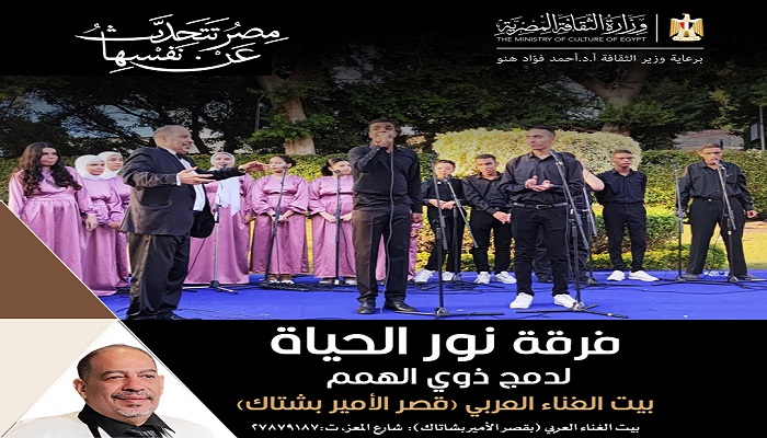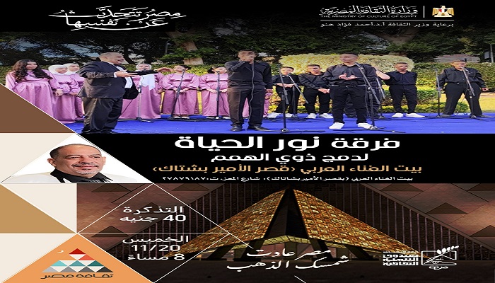 يقيم بيت الغناء العربي التابع لقطاع صندوق التنمية الثقافية بمقره بقصر الأمير بشتاك بشارع المعز، حفلًا موسيقيًا جديدًا تُحييه فِرْقَة «نور الحياة»، تحت قيادة المايسترو دكتور محسن صادق وذلك في الثامنة مساء اليوم الخميس20 نوفمبر.