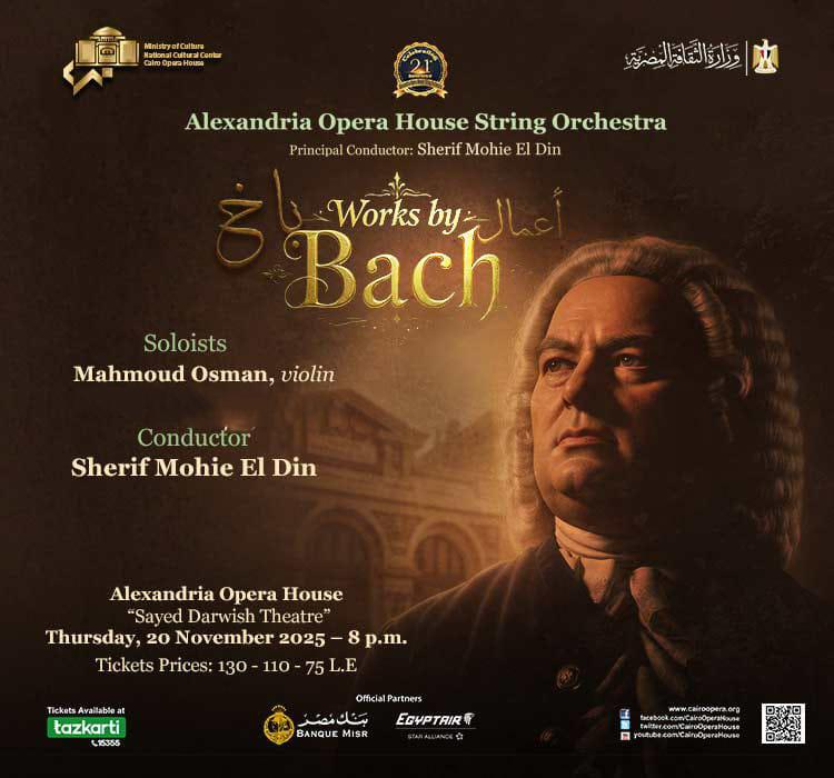 تقيم دار الأوبرا المصرية حفلًا لأوركسترا وتريات أوبرا الإسكندرية بقيادة المايسترو شريف محيي الدين ومشاركة عازف الفيولينة الدكتور محمود عثمان، وذلك في الثامنة مساء اليوم الخميس 20 نوفمبر على مسرح سيد درويش «أوبرا الإسكندرية» يتضمن مجموعة من أهم ألحان المؤلف الموسيقى العالمي يوهان سباستيان باخ«باخ».