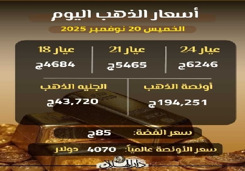 استقرت أسعار الذهب في مصر اليوم الخميس 20 نوفمبر 2025، خلال التعاملات الصباحية، حيث سجل سعر عيار 21 نحو 5465 جنيهًا، وسجلت الأونصة عالميًا نحو 4070 دولارًا.