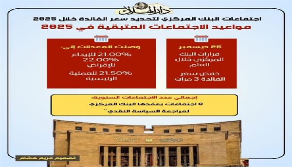 يعقد البنك المركزي المصري 8 اجتماعات سنويًا لمراجعة السياسة النقدية، وتحديد أسعار الفائدة بناءً على أداء المؤشرات الاقتصادية وبعد اجتماع نوفمبر، يتبقى اجتماع واحد فقط خلال العام سيكون يوم الخميس 25 ديسمبر 2025.