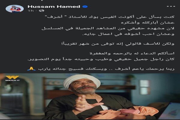 كما طالب بالدعاء له: اسألكم الدعاء له بالرحمه والمغفرة،كان راجل جميل حقيقي وطيب وحبيته جداً يوم التصوير، ربنا يرحمك ياعم أشرف .. ويسكنك فسيح جناته يارب.