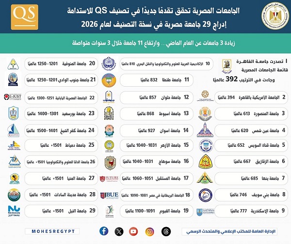 أعلن تصنيف QS العالمي للاستدامة نتائج نسخته الجديدة لعام 2026، والتي كشفت عن زيادة في تمثيل الجامعات المصرية داخل التصنيف؛ حيث تم إدراج 29 جامعة مصرية في نسخة هذا العام، لتحقق ارتفاعًا متواصلًا بعد أن كانت 18 جامعة فقط في نسخة 2024، ثم 26 جامعة في نسخة 2025، مع الحفاظ على جميع الجامعات التي ظهرت سابقًا دون خروج أي جامعة، وانضمام ثلاث جامعات لأول مرة، وهي: جامعة سوهاج، والجامعة البريطانية في مصر، وجامعة النيل.