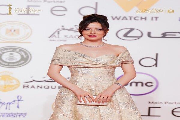 وظهرت الفنانة مرتدية فستانًا أوف شولدر بلون ذهبي فاتح، مصنوعًا من قماش بنقشة بارزة تمنحه طابعًا ملكيًا. تميّز الفستان بقصّة كلاسيكية تُبرز الخصر وتنطلق بسلاسة نحو الأسفل، ما أضفى عليها مظهرًا أنثويًا متوازنًا بين العصرية والرقي.