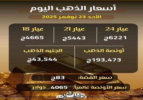 استقرت أسعار الذهب في مصر اليوم الأحد 23 نوفمبر 2025، في العطلة الأسبوعية، حيث سجل سعر عيار 21 نحو 5443 جنيهًا، وسجلت الأونصة عالميًا نحو 4065 دولارًا.