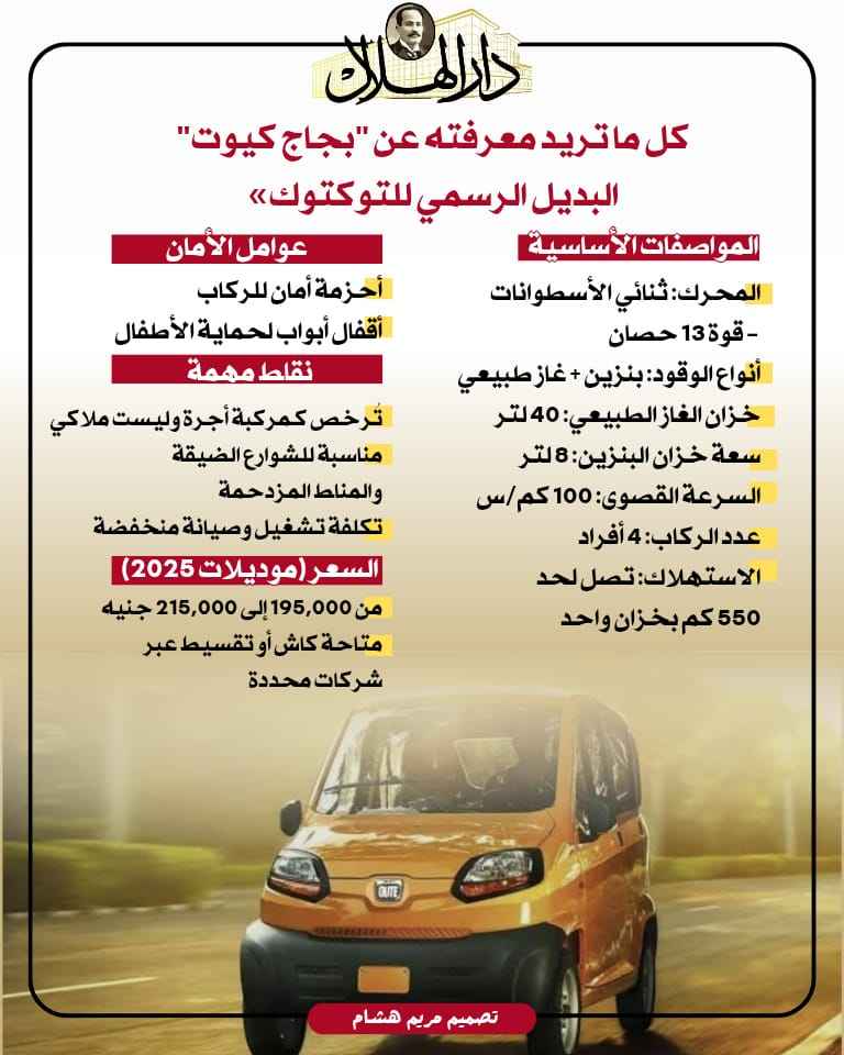 مع ازدياد البحث عن بديل آمن ومرخّص للتوك توك في الشوارع المصرية، برزت سيارة "بجاج كيوت" كأحد أكثر المركبات التي لفتت الأنظار خلال الفترة الأخيرة.
