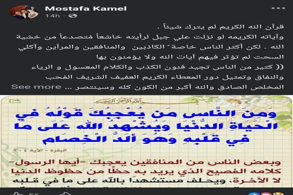 ومن جانبه رد مصطفى كامل نقيب الموسيقيين عبر حسابه الرسمي على موقع التواصل الاجتماعي الفيسبوك، قرآن الله الكريم لم يترك شيئاً، وآياته الكريمة لو نزلت علي جبل لرأيته خاشعًا متصدعًا من خشية الله . لكن أكثر الناس خاصة ً الكاذبين والمنافقين والمرآين وآكلي السحت لم تؤثر فيهم آيات الله ولا يؤمنون بها.