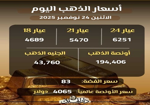 استقرت أسعار الذهب في مصر اليوم الاثنين 24 نوفمبر 2025، مع بداية التعاملات الأسبوعية، حيث سجل سعر عيار 21 نحو 5470 جنيهًا، بينما سجلت الأونصة عالميًا نحو 4066 دولارًا.