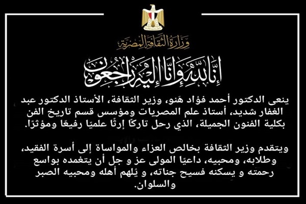 وجاء في البيان، ينعى الدكتور أحمد فؤاد هنو، وزير الثقافة، الأستاذ الدكتور عبد الغفار شديد، أستاذ علم المصريات ومؤسس قسم تاريخ الفن بكلية الفنون الجميلة، الذي رحل تاركا إرثا علميا رفيعا ومؤثرا.