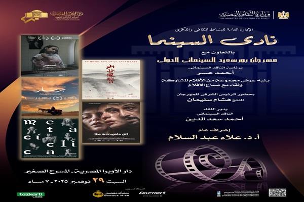 تنظم الإدارة العامة للنشاط الثقافي والفكري بالمركز الثقافي القومي نادي السينما، بالتعاون مع مهرجان بورسعيد السينمائي الدولي برئاسة الناقد السينمائي أحمد عسر، فعالية سينمائية مميزة تتضمن عرض مجموعة من الأفلام المشاركة يتبعها لقاء مفتوح مع صُناع هذه الأعمال.