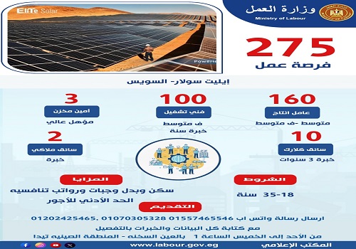 في إطار تنفيذ توجيهات وزير العمل محمد جبران بتوفير فرص عمل لائقة للشباب، وتعزيز فرص التشغيل داخل المشروعات الصناعية، أعلنت وزارة العمل اليوم، عن توفير 275 فرصة عمل جديدة لأبناء محافظة السويس، وذلك للعمل بشركة “إيليت سولار” العاملة في مجال الصناعات والتقنيات المرتبطة بالطاقة.